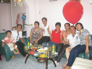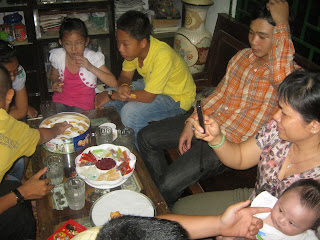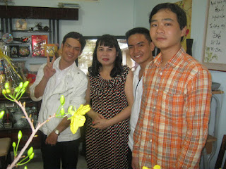 Hơn 3h đồng hồ đoàn trãi qua gần 10 gia đình đoàn sinh, nhận được rất nhiều lời chúc mừng năm mới và những bao lì xì may mắn đầu năm. Dường như cả đoàn cũng thấy hơi đói đói ở trong cái bụng. Và một điều rất trùng hợp khi GĐPT dừng chân tại nhà của chị Ánh Hồng mẹ bé Hoàng Phúc, tại đây lại khác với bao gia đình trước chị Hạnh ngoài việc vui mừng vì đoàn đến chúc tết thì chị đã chạy ngay vào bếp dọn sẵn cho đoàn một bữa ăn nhẹ rất thịnh soạn gồm món đặc biệt của ngày tết cổ truyền. Đặc biệt là món bánh tét ăn với dưa muối....Mô Phật đang đói mà gặp những món ngon thế này thì làm sao từ chối được. Thế là cả đoàn cùng nhau quay quần bên bàn ăn, ai cũng ăn rất ngon với một không khí rất ấm áp và vui vẻ của ngày xuân.
