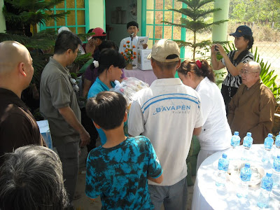 Phát quà cho các Phật tử thuộc họ đạo tại tòa thánh thất TT Võ Xu xong đồng hồ chỉ hơn 12h. Lễ sanh: Thượng Hơn Thanh - cai quản dòng họ Đạo đại diện các PT tại đây đã mời cả đoàn tham dự buổi cơm trưa thân mật cùng với bà con và các PT tại đây.